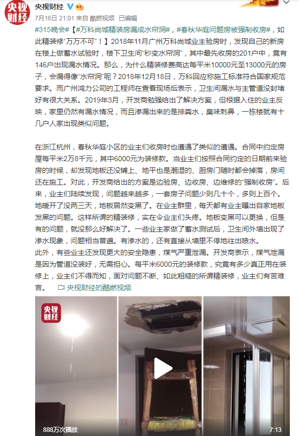 2020年央视315晚会就曝光了万科精装房出现质量问题:新房反水、厨房门窗质量粗制滥造、以次充好、简单装修备案成昂贵的精装修等。据某验房机构公开的一份涉及各大知名开发商近10个楼盘100户新房的验房报告显示,验房时发现了门窗、地板、墙面、厨柜、水电、五金配件等十大类约40个质量和瑕疵问题点。
