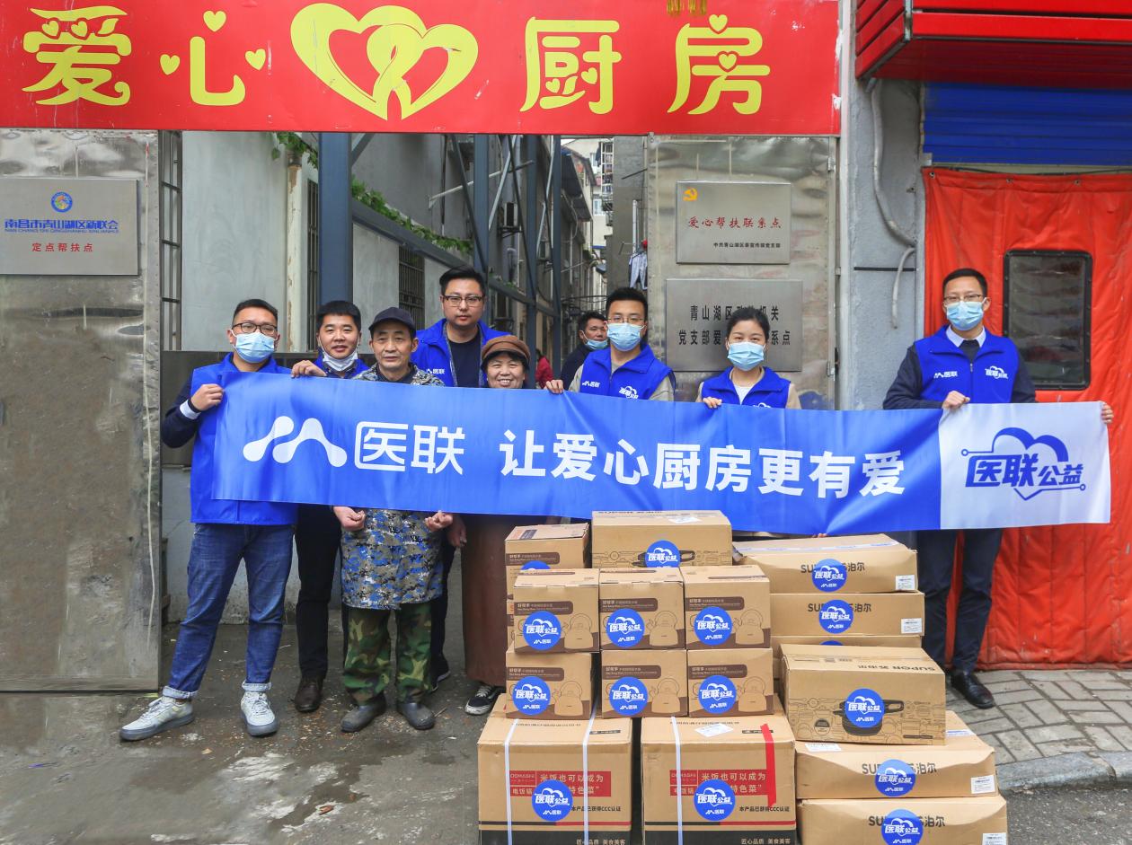 除联动三甲医院医生进行直播义诊,4月15日全国抗癌日当天,医联还来到江西省肿瘤医院旁的“抗癌厨房”,为“感动中国2020年度人物”的获奖者万佐成和熊庚香夫妇捐赠了爱心物资,并免费提供了500份肿瘤健康服务包供来店者领取。“抗癌厨房”成立18年来,万佐成和熊庚香与癌症病人相伴,用爱心守护他们,始终鼓励每个人勇敢地和病魔斗争,他们的故事温暖了无数人。医联也希望通过捐赠“抗癌厨房”,帮助到更多的癌症家庭。