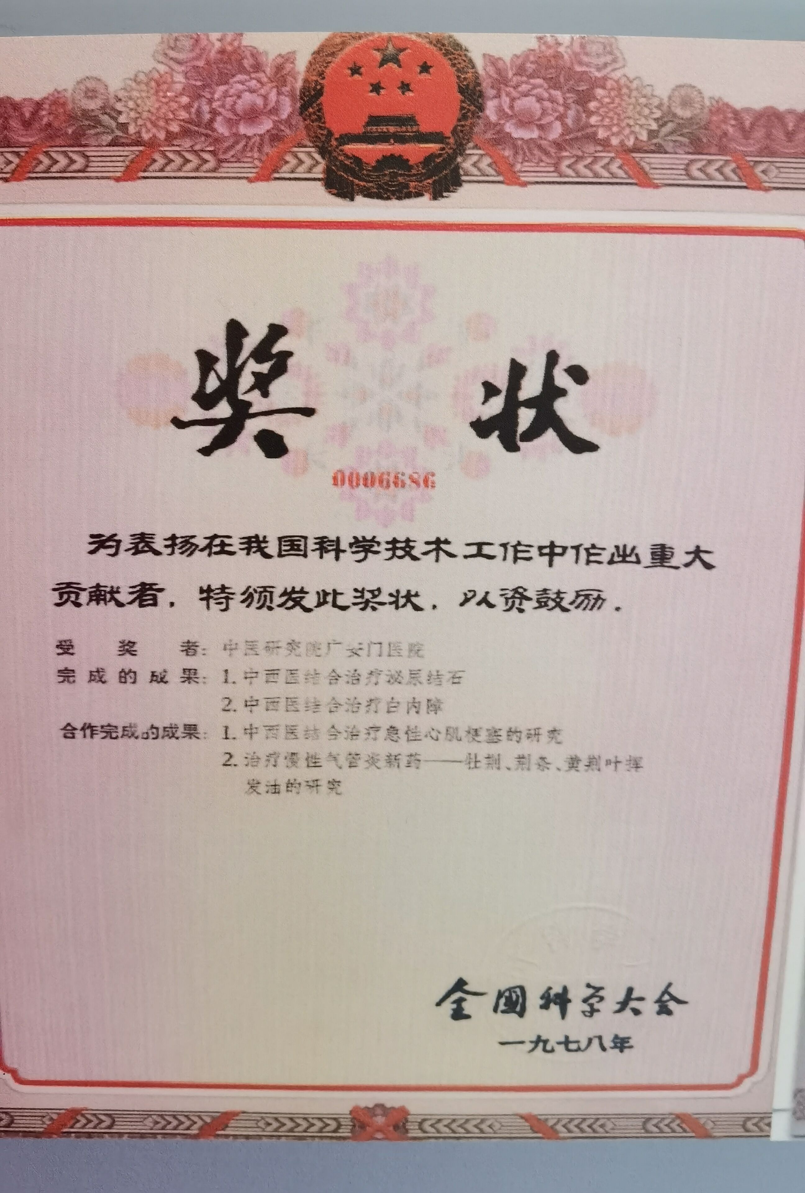 医生同行们的认可、患者的受益,使我初次感受到临床科研工作的价值。于是我进一步总结并撰写了《169例急性心肌梗塞舌诊观察》一文,发表在《中医药杂志》,获得了当年的北京市卫生局先进科技成果奖。当年合作完成的“中西医结合治疗急性心肌梗塞”研究,也先后获得了北京市先进科技成果一等奖、原卫生部先进科技成果奖和全国科学大会的表彰,这给了我更大的鼓励。▲