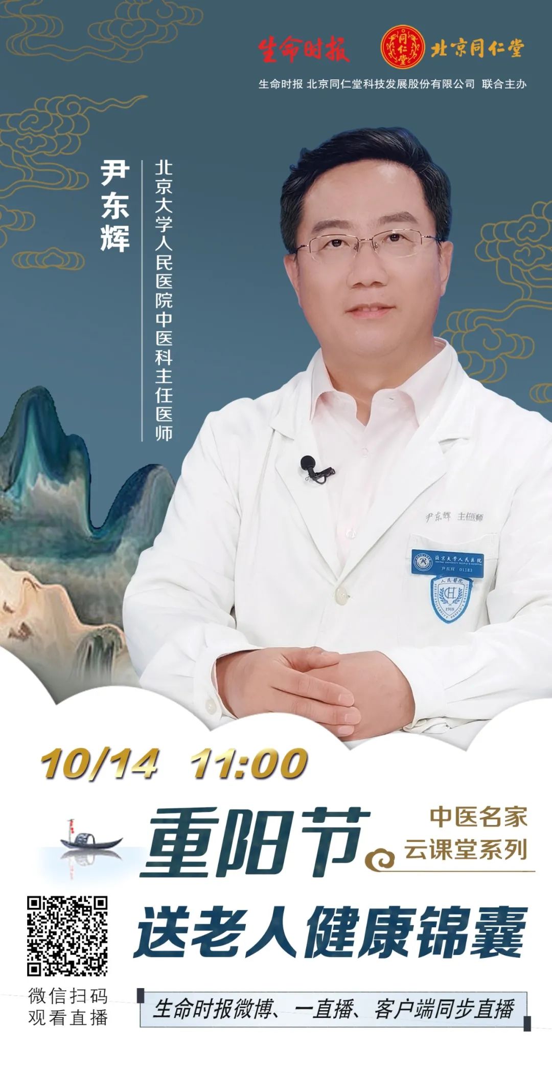 由生命时报社、北京同仁堂科技发展股份有限公司共同主办的“中医名家云讲堂”系列活动,特别邀请到了北京大学人民医院中医科主任医师尹东辉,请他为老人们送上几道“健康锦囊”。