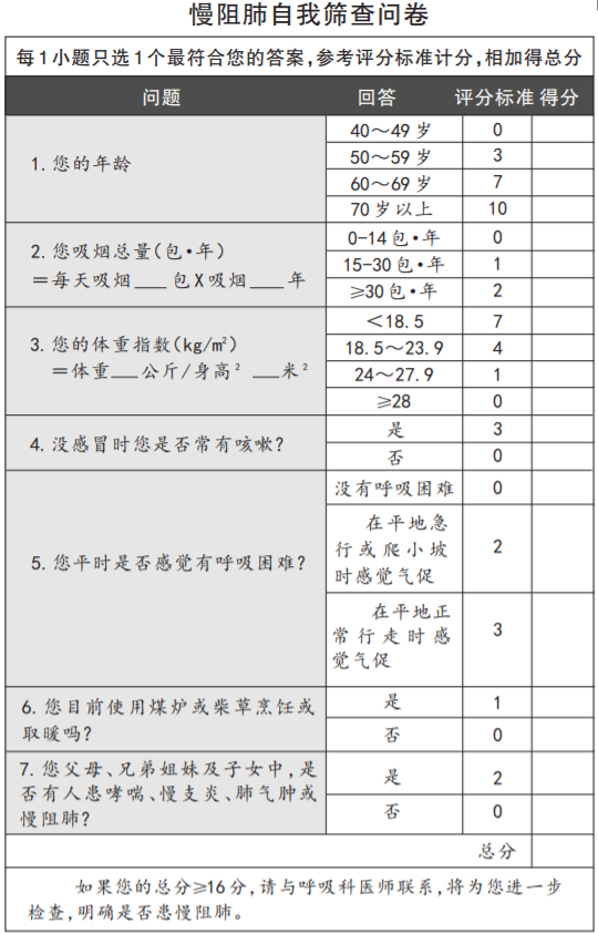 如果当地没有肺功能检查条件,我们推荐一个简易的“慢阻肺筛查问卷”进行初步筛查。