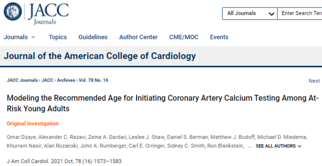 研究共纳入22346名受试者,平均年龄43.5岁,25%为女性。科研人员通过冠脉CT平扫,计算了每位受试者的冠脉钙化积分,并评价了他们是否合并有动脉粥样硬化性心血管病的危险因素,如高血压、糖尿病、血脂异常、吸烟、冠心病家族史等。结果发现,34%的受试者存在冠脉钙化,积分中位数为20;与没有危险因素的人相比,糖尿病患者冠脉钙化平均提前了6.4年(男性5.5年,女性7.3年);合并了吸烟、高血压、血脂异常、冠心病家族史的人,冠脉钙化提前了3.3~4.3年。综合多种因素后,研究人员给出了男性和女性冠脉钙化检查的最佳年龄分别为:1.没有动脉粥样硬化性心血管病危险因素的人,初次检测时间最好在42.3岁和57.6岁;2.仅有糖尿病者,检查年龄应在36.8岁和50.3岁;3.仅有血脂异常者为39.3岁和52.1岁;4.仅有冠心病家族史者为39.3岁和53.3岁;5.仅有高血压者为39.4岁和53.1岁;6.仅吸烟者为40.4岁和52.9岁;7.合并了冠心病家族史和血脂异常的人,检测年龄最好在36.3岁和47.8岁;8.合并有冠心病家族史和高血压的人,则为36.4岁和48.9岁。