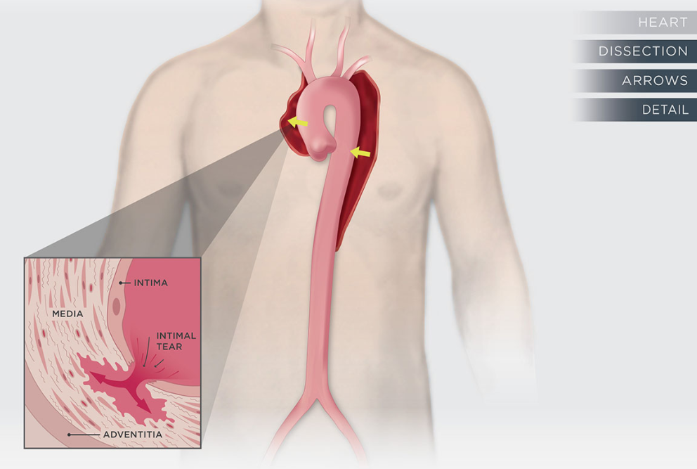 人体的动脉管壁由内层、中层和外层组成,当主动脉内层不慎撕裂后,腔内的血液就会通过内层破口进入动脉壁中层,继而形成夹层血肿,该血肿又会逐渐沿血管长轴方向扩展,形成动脉真、假腔病理改变的严重主动脉疾病,即主动脉夹层。