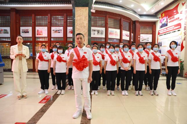 北京瑶医援沪医疗队队长覃迅云教授带领瑶医援沪医疗队宣誓:“我们将在疫情防控战斗中,发扬德坤瑶医精神,不辱使命,保证圆满完成支援救助任务。”