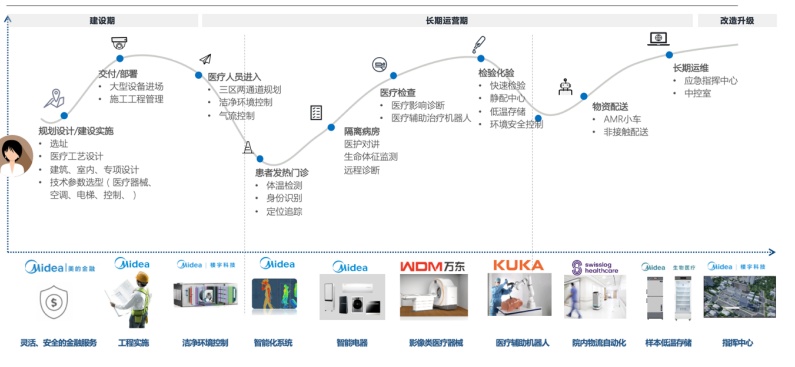 据美的最新发布的《2022方舱医院及平疫结合医院建设实践指南》所介绍,方舱医院的建设和运营过程对医疗动线有着极高的要求,从暖通空调正负压气流的控制、环境参数监控、安全防范、医疗专网系统等智能化系统配置,到医疗诊断设备、低温存储技术,再到远程护理呼叫、无人配送等非接触式医疗辅助应用,都要兼顾“建设成本、施工周期、疫时承载力、平时利用率”等维度的综合考量。
