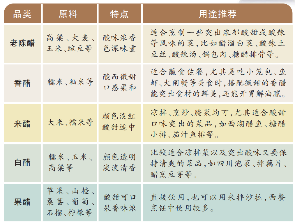 高级烹饪技师 胡德明醋是家家户户必备的调料,在烹调中它有很多妙用,比如能去除腥膻味,增加香味,中和碱味,让海带等食材更易煮熟,还能保护紫甘蓝、茄子等紫红色蔬菜的色泽,促进钙质溶出。适当加醋还能增强咸味,减少盐的摄入。目前市场上常见的有老陈醋、香醋、米醋、白醋和果醋等。它们之间有啥区别,又分别适合做什么菜呢?以下一张表格可以一目了然。