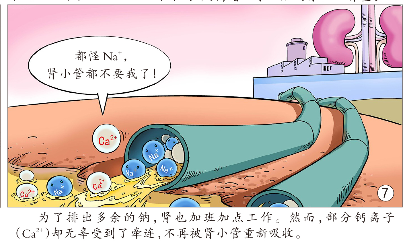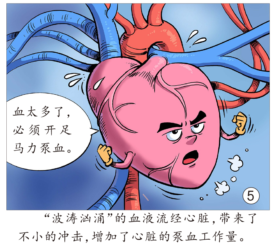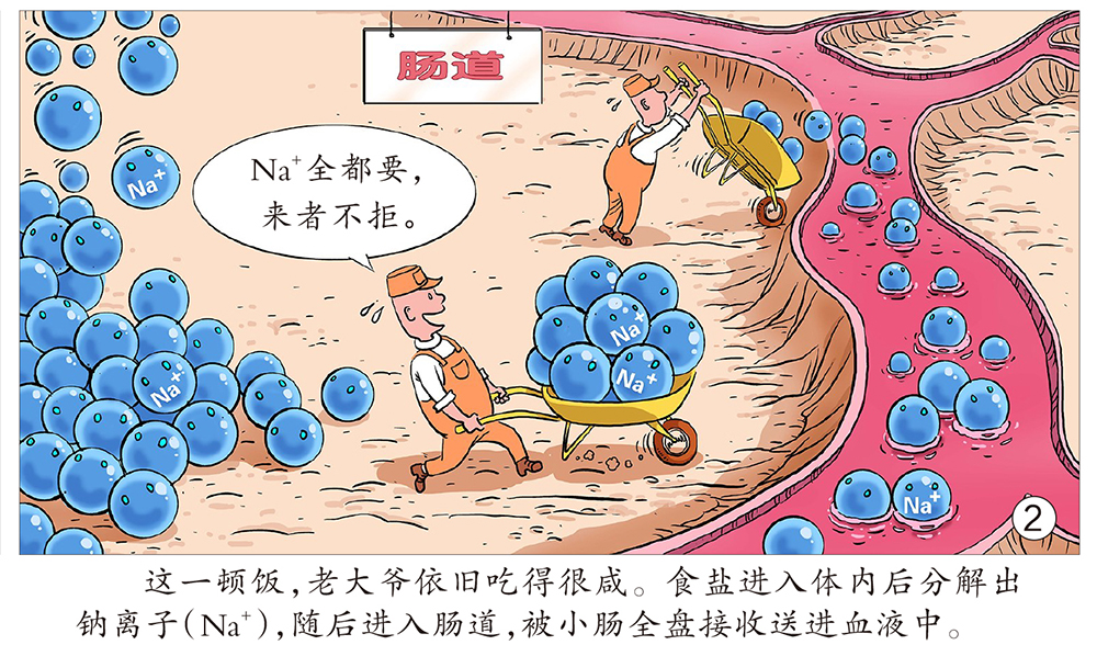 食盐中的钠几乎都会被小肠吸收,随后进入血液。若吃了太多盐,钠所处的细胞外液渗透压升高,刺激下丘脑饮水中枢产生渴觉,人便会主动喝水。这些水很快会进入血液,并被里面的钠“牢牢抓住”,血液中的水分变多,全身血容量增加。此外,由于高浓度钠令血液的渗透压增高,组织间的水分也可能透过血管壁进入血液,从而引起血容量增加。当更多的血液流经血管,导致血管壁受到的压力增加,阻力变大,即血压升高。与此同时,心脏泵血需要克服更多的负荷,久而久之会造成心脏肥大等,是心脑血管疾病的祸根,尤其是心功能不全者,盐吃多了可能诱发急性左心衰竭。值得注意的是,生命早期钠的摄入对成年后血压也有影响。