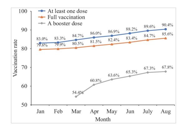 但与一些发达国家相比,我国60岁及以上老年人全程接种新冠疫苗和加强针的比例较低。截至2022年8月10日,我国老年人全程接种率为85.6%,加强接种率仅为67.8%,低于美国(92.1%、70.7%)、德国(91.2%、85.9%)和日本(92.4%、90.3%)。