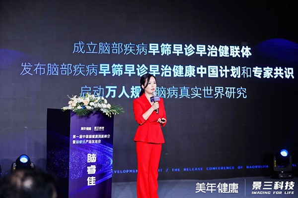景三科技创始人兼CEO沈逸凌发表了主题为“‘脑睿佳’助力全周期脑健康精准预防诊治”的主旨演讲,她表示,“脑睿佳”的发布,有最朴素的愿望,让每个家庭不再因卒中而有遗憾,不再因痴呆而有恐惧,让每一个人都能拥有脑健康。景三科技从20多年前在剑桥大学研究室做兔子内膜剥脱试验开始,到今天联合美年健康,完成“脑睿佳”全国上线,实现了让大多数人先预见脑健康的愿望。景三科技将进一步联合美年健康,围绕“脑睿佳”,持续上线核桃宝宝®认知训练、小花健康™健康管理及首亲首倍®保险兜底服务等,建立全生命周期脑健康精准预防管理服务模式。不久的将来,景三科技、美年健康将会成立“脑部疾病早筛早诊早治健联体”;发布脑部疾病早筛早诊早治健康中国计划;组织制定脑健康专家共识;启动万人规模脑病真实世界研究。