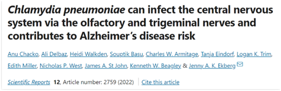 澳大利亚格里菲斯大学的研究人员在《科学报告》杂志上发表的研究首次证实了肺炎衣原体可直接通过鼻子进入大脑。研究所选择的肺炎衣原体是一种呼吸道病原体,主要通过飞沫传播,感染肺和鼻黏膜,可引发肺部急性炎症。通常,多数患者感染后症状较轻,以发热、干咳、咽痛为主。