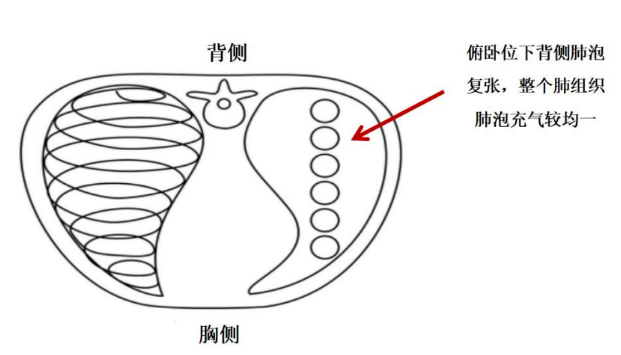趴着的时候,受重力作用,水往低处走,有利于更好地引流出背侧肺泡内的渗出液,还可以减轻心脏、膈肌等对背侧肺组织的重力压迫,以便气体更容易进入背侧肺泡,促进气体在肺组织内的均匀分布,改善气血交换,带走二氧化碳,缓解缺氧症状,保护肺组织。