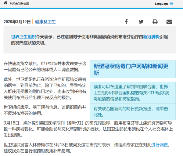《柳叶刀》这项论文一经发布,立刻引起医学界的关注。2020年3月,欧洲心脏病学会、国际高血压学会、美国心脏协会等相继发表声明,认为这种推测缺乏证据。2020年3月18日,世卫组织就布洛芬是否会加重新冠症状再次做出说明:“到目前为止,除了已知的、导致特定人群使用受限的副作用之外,尚未收到任何有关使用布洛芬后出现不良反应的报告。”其表示:“基于现有信息,目前不反对布洛芬的使用。”