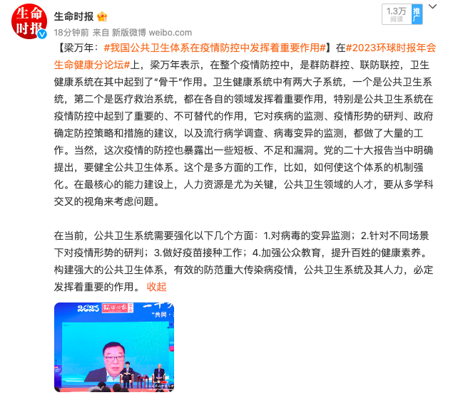 在2023环球时报年会生命健康分论坛上,梁万年表示,在整个疫情防控中,是群防群控、联防联控,卫生健康系统在其中起到了“骨干”作用。卫生健康系统中有两大子系统,一个是公共卫生系统,第二个是医疗救治系统,都在各自的领域发挥着重要作用,特别是公共卫生系统在疫情防控中起到了重要的、不可替代的作用,它对疾病的监测、疫情形势的研判、政府确定防控策略和措施的建议,以及流行病学调查、病毒变异的监测,都做了大量的工作。当然,这次疫情的防控也暴露出一些短板、不足和漏洞。党的二十大报告当中明确提出,要健全公共卫生体系。这个是多方面的工作,比如,如何使这个体系的机制强化。在最核心的能力建设上,人力资源是尤为关键,公共卫生领域的人才,要从多学科交叉的视角来考虑问题。