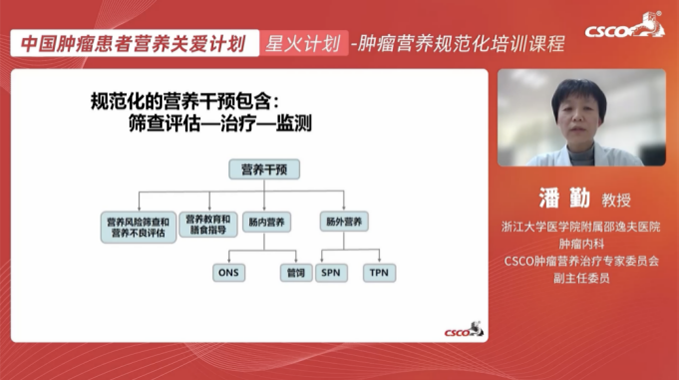 在药师服务能力培养方面,CSCO肿瘤营养治疗专家委员会构建了阵容强大的顾问团队,为打造多元的药师培训课程及服务能力体系,将对其进行一系列指导和培训。第一期培训课程由CSCO肿瘤营养治疗专家委员会副主任委员潘勤教授,浙江大学医学院附属邵逸夫医院冯丽君教授、吴燕教授担任主讲,就营养风险筛查和评估、肿瘤患者肠内营养制剂的临床应用等进行了规范化课程培训。