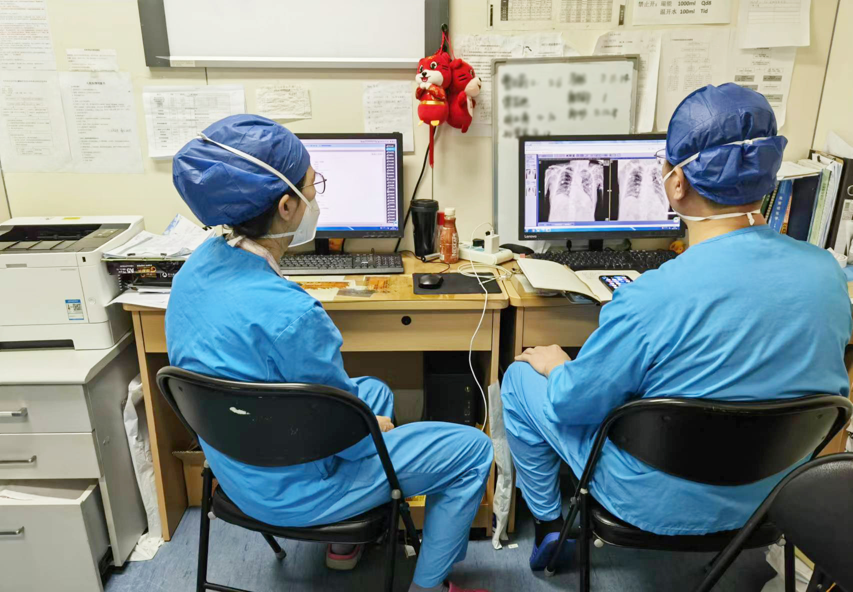 开展培训,进行同质化管理。周庆涛介绍:“从第六个亚重症病房开始,负责人就不是呼吸内科专家了。”为保证诊疗质量、各病房同质化管理,呼吸内科做了几项工作。首先,给每个呼吸亚重症病房安排对接的呼吸内科咨询指导专家,进行专业指导。其次,3位呼吸内科的呼吸治疗师划分责任区域,每日巡查,悉心指导无创呼吸机、经鼻高流量氧疗、俯卧位操作。最后,制作“亚重症病房救治同质化培训”课程,为非呼吸内科负责人培训救治肺炎患者的专业技术。“昨晚就有一次培训,300余人在线听课,效果不错。”周庆涛说。