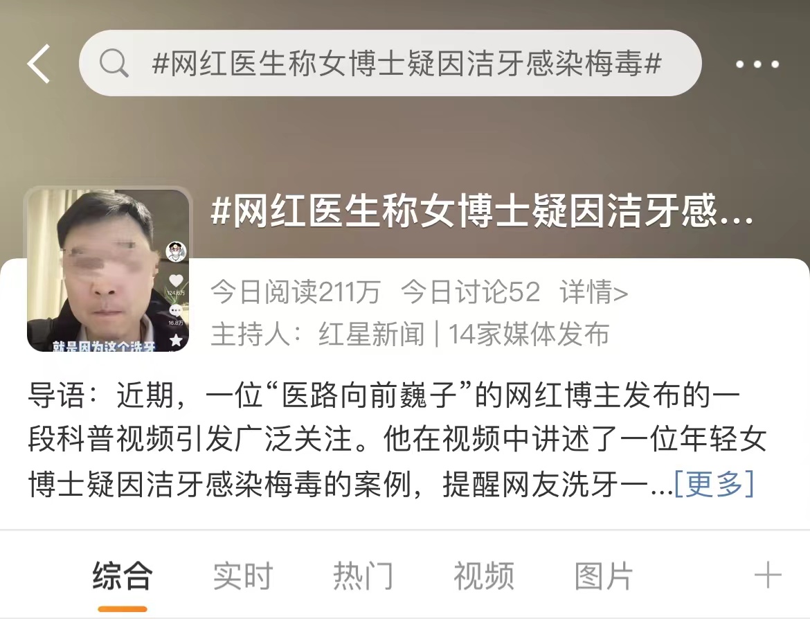 近期,一位网名为“医路向前巍子”的医生博主发布的一段视频引发广泛关注。他讲述了一名年轻女士疑因洁牙感染梅毒的案例,提醒网友洗牙一定要去正规的医疗机构。