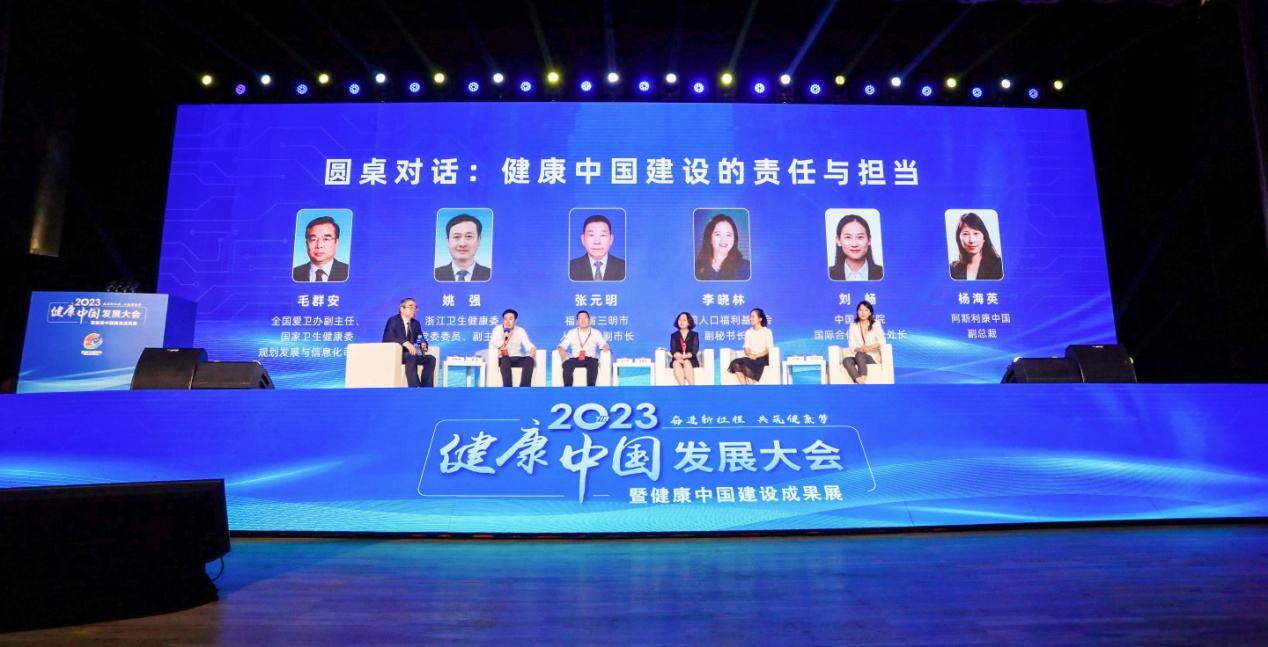 国家卫生健康委规划发展与信息化司司长毛群安主持以“健康中国建设的责任与担当”为主题的圆桌对话。浙江省卫生健康委党委委员、副主任姚强,福建省三明市人民政府副市长张元明,中国人口福利基金会副秘书长李晓林,中国工程院国际合作局一处处长刘畅,阿斯利康中国副总裁杨海英分享了各自领域在健康中国建设中的责任和担当。