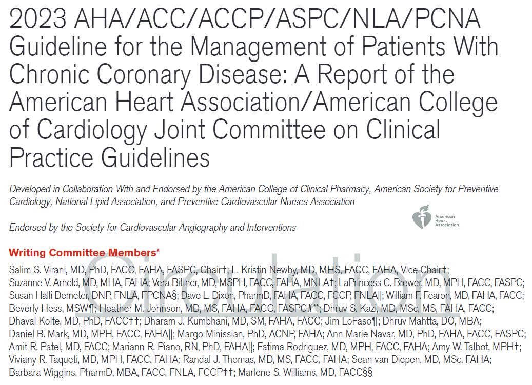 慢性冠状动脉疾病是由于冠状动脉存在功能障碍或解剖学狭窄导致的,以慢性缺血性心脏改变为主要表现的一组疾病,主要包括隐匿性冠心病、稳定型心绞痛和缺血性心肌病等,是目前全球范围内患病率最高的心血管疾病之一,严重威胁人们的身体健康。近日,美国心脏协会、美国心脏病学会、美国胸科医师学会、美国心脏病预防学会、美国国家脂质协会以及美国心血管预防护理学会共6个学术组织,联合在国际期刊《循环》杂志上发布了慢性冠状动脉疾病患者管理指南。新指南距离上一版本已间隔近9年,在此期间,冠心病患者的管理手段和理念均取得了显著发展,新的临床试验结果也带来了新的变革。