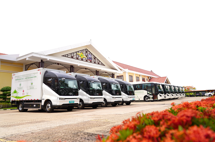 沿着老挝首都万象最好的道路进入赛色塔综合开发区,车道旁是绿油油的稻田,园区内一栋栋现代化厂房与老挝的传统农业相得益彰,不时驶过的蓝色涂装新能源汽车,与白云、绿树、蓝天构成一幅和谐的画面。