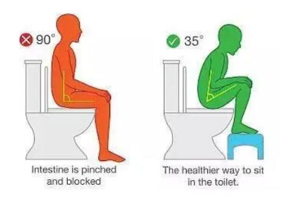 4.蹲姿不如坐姿健康。国内曾有调查显示,在所有不良排便习惯中,不良排便姿势、上厕所看手机、排便不定时、忍便等四种最常见,其中不良排便姿势的比例占83.2%。朱欣佚说,传统观念认为,最原始的蹲式是最利于排便的姿势,这其实是一种认识上的误区。尤其对于老人来说,他们下肢力量减弱,如果选择蹲姿可能会有一些难度,容易摔倒。理想的姿势是,在坐便时,可将双脚略抬高,使大腿与身体有约35°的夹角,这样直肠下段就相对平直,此时排便也更容易。(如图)