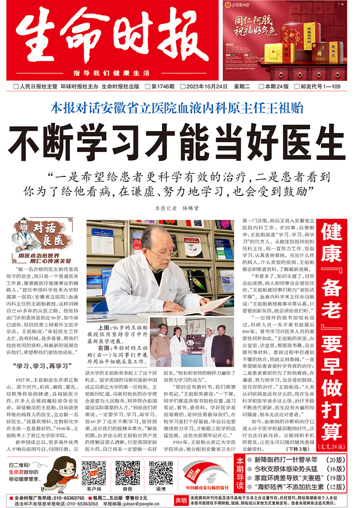 “做一名合格的医生始终是我恪守的信念,我只是一个普通医务工作者,愿意做医疗健康事业的铺路人。”曾任中国科学技术大学附属第一医院(安徽省立医院)血液内科主任的王祖贻教授,这样回顾自己60多年的从医之路。他坚持出门诊和查房直到近90岁,如今虽已退休,但仍经常上网看外文医学杂志。王祖贻说:“年轻医生工作太忙,我有时间,我多看看,帮他们找些有用的资料,将最新的进展告诉他们,希望帮他们更快地成长。”