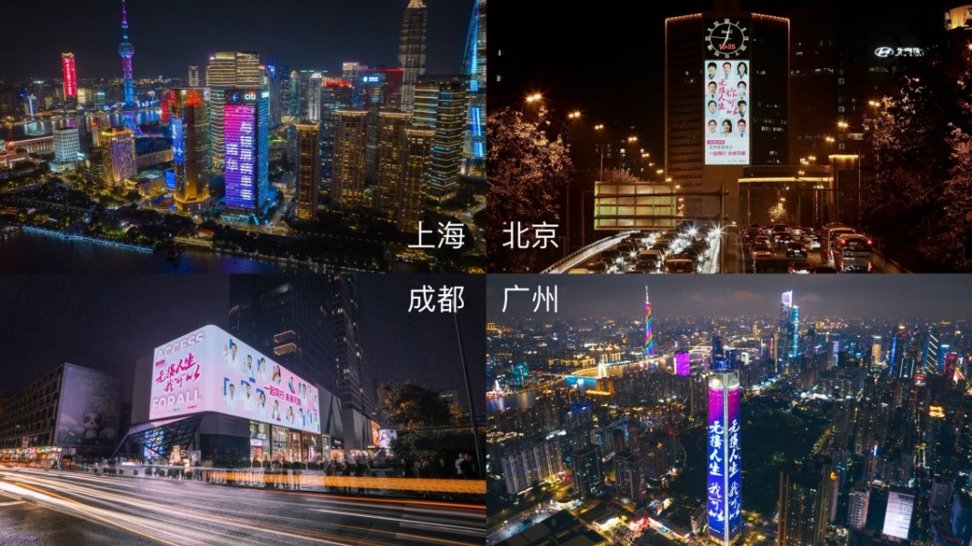 作为本次疾病日系列活动的亮点之一,四地“地标点亮”活动旨在引发各界对银屑病的关注,通过点燃银屑病患者心中寻找希望的那束光,助力每位银友都可以早日拥抱“无损人生”。世界银屑病日所在周期间,“无损人生我可以”、“一起同行未来可期”等滚动播放的标语在北京、上海、广州、成都四地核心商圈闪耀城市夜空,打造动感、愉悦、有爱、有温暖的空间,吸引众多行人驻足观赏并打卡,掀起一场关于‘银屑病可控可治’的情感共振,预计有数千万人次见证了这场全国首次为银屑病患者而开展的点亮地标活动。