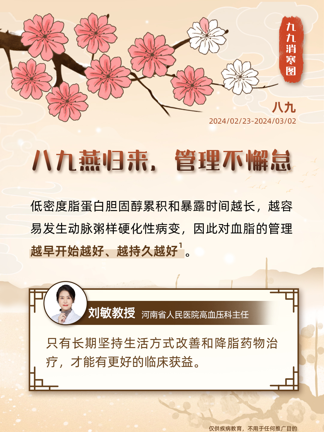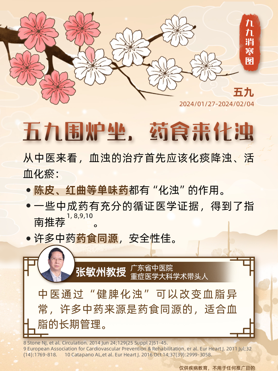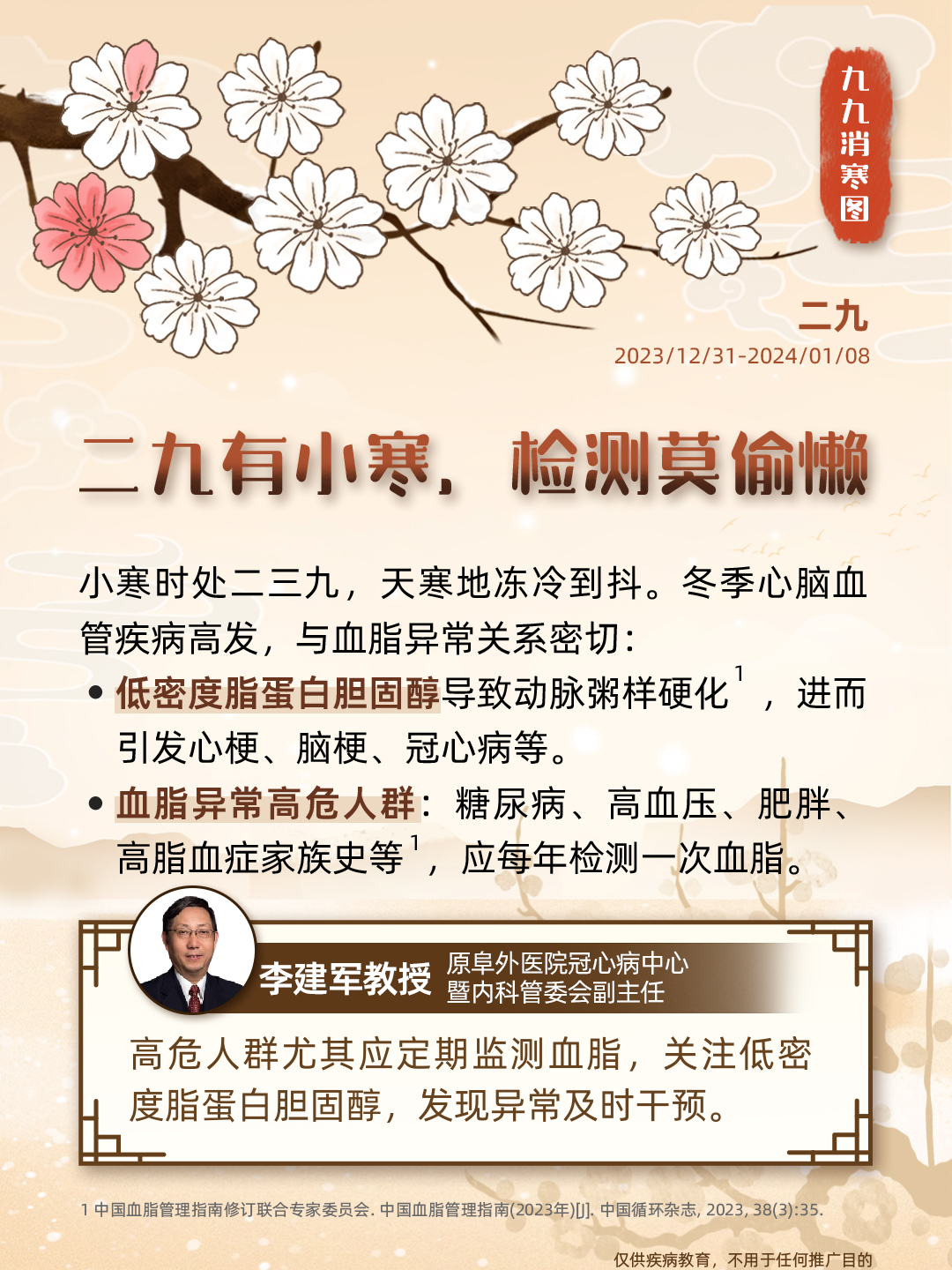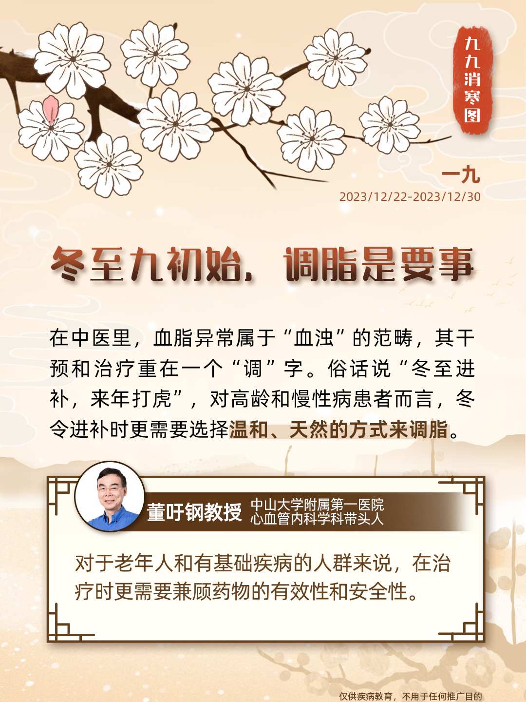 “数九”是中国民间独特的寒暖计算法,画完九个“九”,意味着大地回暖,春耕将至;同时,这一时节也被认为是进补养生的黄金期,冬令进补虽好,但这个指标也不容忽视——血脂。血脂异常危害大,从中医的角度来说,血脂异常属于“血浊”的范畴,即血液变得瘀滞,不再清澈。秉承“上医治未病”的理念,我们携手九位临床专家,从食、药、养等角度谈谈血脂健康,古为今用,诚意奉上一份「调脂版」九九消寒图,让我们安心数九度寒冬,一同迎接春天的到来。