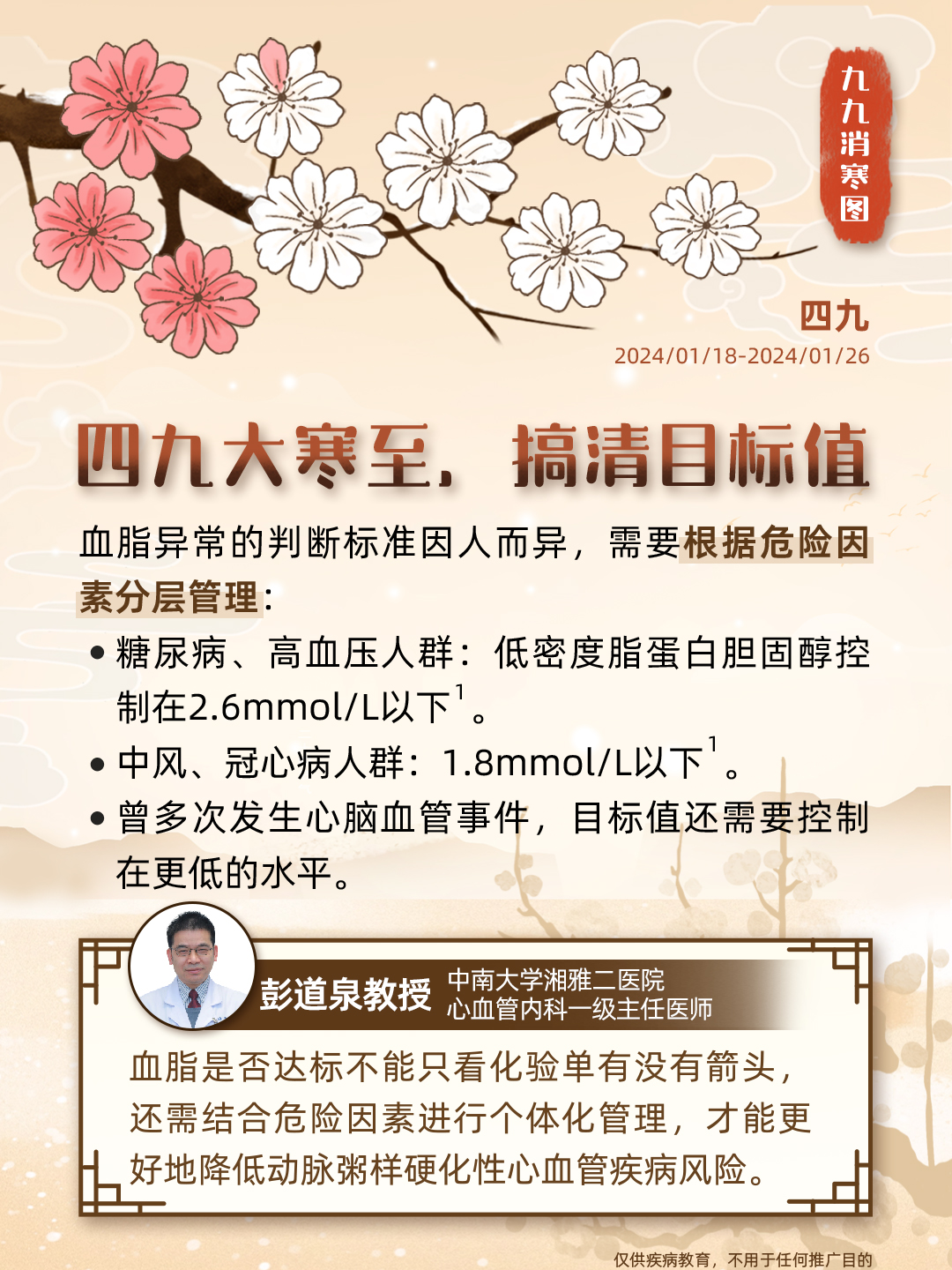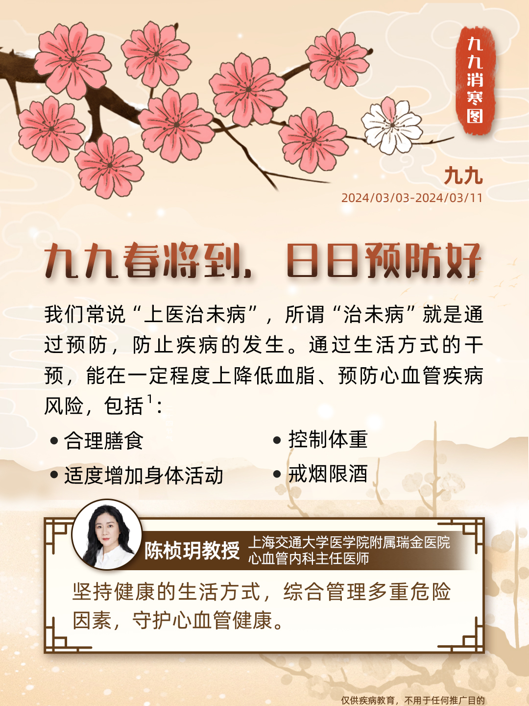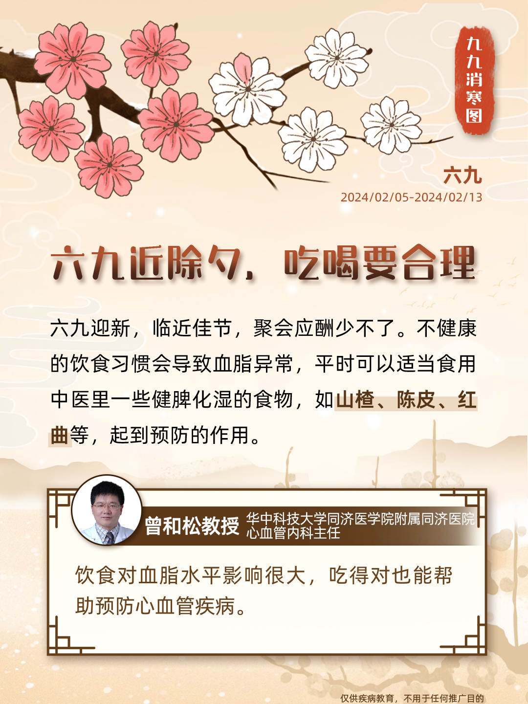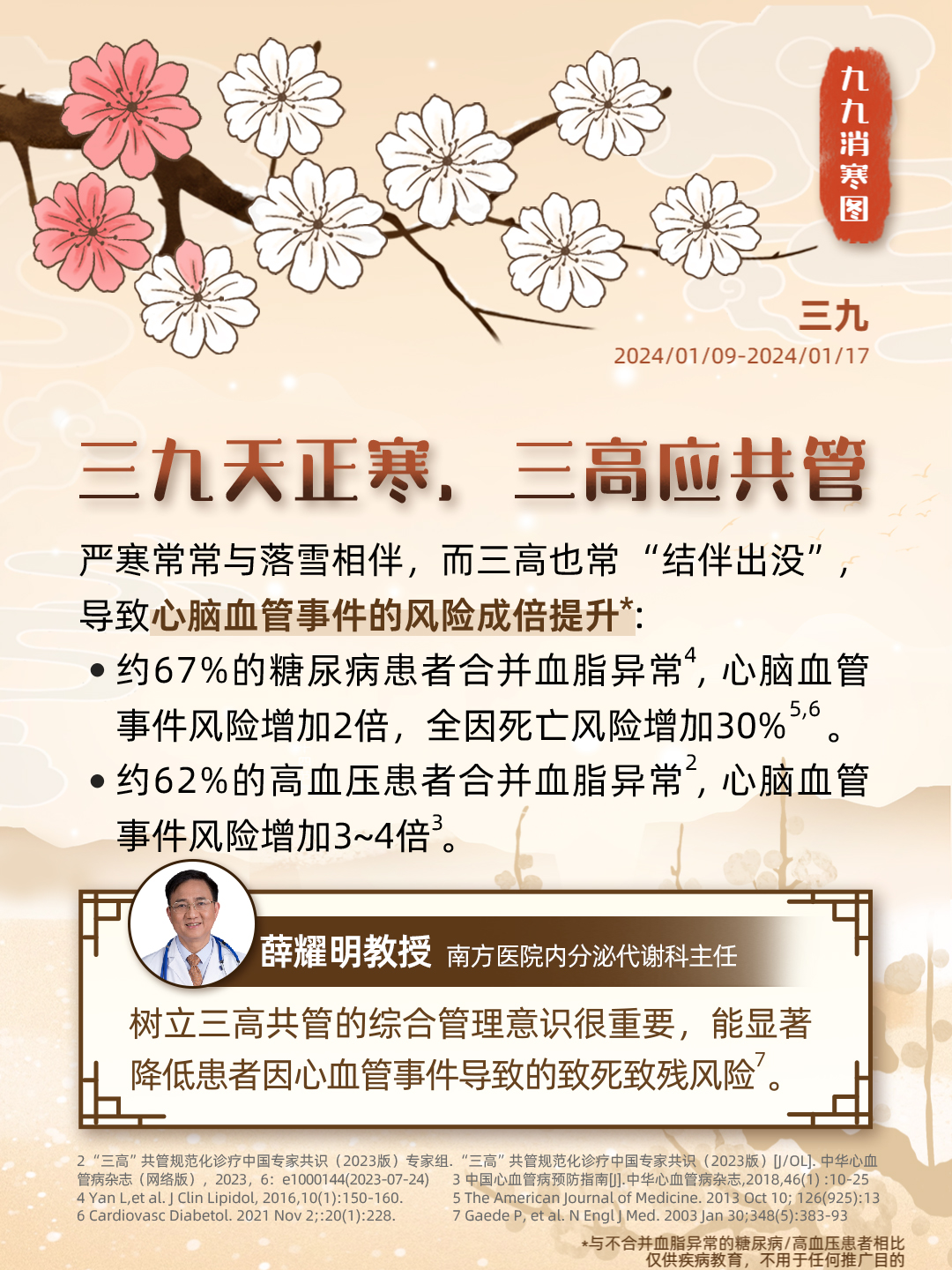 “数九”是中国民间独特的寒暖计算法,画完九个“九”,意味着大地回暖,春耕将至;同时,这一时节也被认为是进补养生的黄金期,冬令进补虽好,但这个指标也不容忽视——血脂。血脂异常危害大,从中医的角度来说,血脂异常属于“血浊”的范畴,即血液变得瘀滞,不再清澈。秉承“上医治未病”的理念,我们携手九位临床专家,从食、药、养等角度谈谈血脂健康,古为今用,诚意奉上一份「调脂版」九九消寒图,让我们安心数九度寒冬,一同迎接春天的到来。