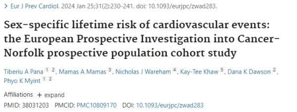 研究纳入来自欧洲诺福克癌症前瞻性调查中的约2.4万名参与者,平均年龄59.2岁,随访26.2年。研究人员分析发现,与女性相比,男性心血管疾病终身绝对风险高11.5%(男性为68.9%,女性为57.4%),且心梗一直是男性心血管首发疾病,直到80岁;而女性中,60岁后心血管首发疾病主要以房颤和脑卒中为主。