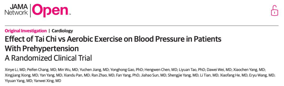 合理运动被认为是控制血压的有效手段之一。近期,中国中医科学院广安门医院、北京中医药大学等多中心学者在《美国医学会杂志·网络开放》上发表最新研究成果:对高血压前期患者来说,平时多打太极拳,降压效果比其他有氧运动更好。