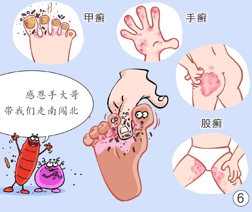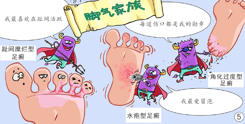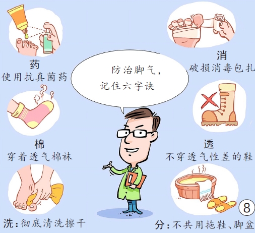 除了治疗外,日常保证脚部卫生十分重要,白天应穿着透气性好的棉质鞋袜,避免穿塑料鞋、皮鞋等不透气的鞋子;晚上最好用温水和肥皂清洗脚部,尤其是脚趾间和脚底,冲洗干净后擦干;不与他人共用拖鞋、毛巾、脚盆等物品,以防传染。▲