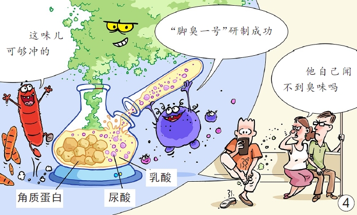 真菌大量繁殖的同时,会分解皮肤中的角质蛋白及汗液中的尿素和乳酸,形成含有臭味的代谢物,从而导致脚臭。