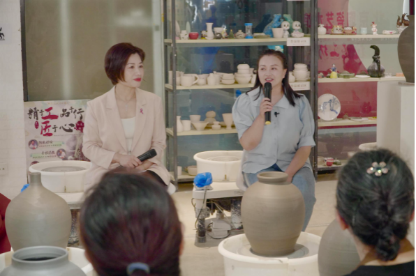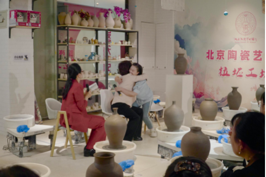 在医患对话环节,莫雪莉教授与乳腺癌康复患者围绕治疗信心、社会回归等话题展开交流。随后双方通过“拥抱”陶土的方式,塑造一件贴合身体曲线的独特艺术品,并以多彩釉色,写下对“重塑新生”的美好期许,以此表达对生命重塑的承诺与期待。此外,现场其他参与者也参观了艺术陶瓷展并体验了陶艺制作过程。