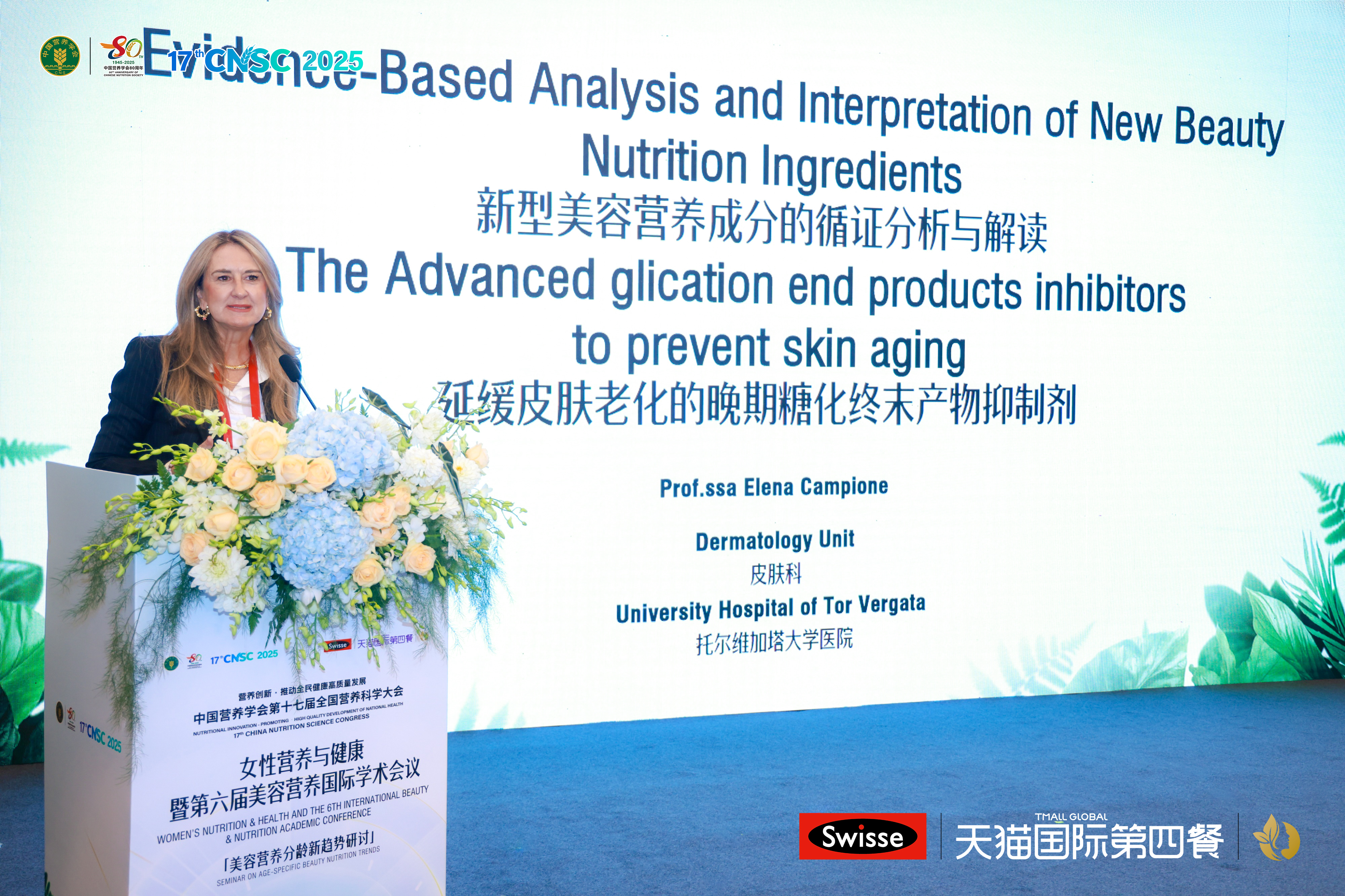 罗马第二大学皮肤实验室负责人Elena Campione教授从“成分支撑”角度带来国际视角的观点,以《美容营养新成分循证分析与解读》为例,印证美容营养已进入“循证时代”,并重点介绍了α-硫辛酸、肉桂提取物、铬等多种抑制AGEs的活性成分,以及麦角硫因的抗衰老机制与证据。