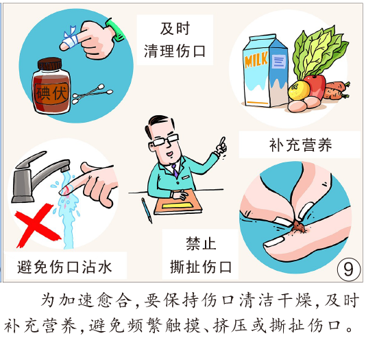 为了顺利完成伤口修复工作,日常需注意如下事项:1.保持伤口清洁和干燥。可先用碘伏等为伤口消毒,并用干净的纱布覆盖,避免伤口沾水,以防细菌滋生,引起感染。2.注意饮食营养。多吃富含蛋白质、维生素和矿物质的食物,如鸡蛋、牛奶、蔬菜、水果等,为伤口愈合提供充足原料。3.避免频繁触摸、挤压或撕扯伤口,以免影响伤口愈合。如果伤口较深或出现化脓等异常情况,要及时就医,避免小伤口引发大问题。▲