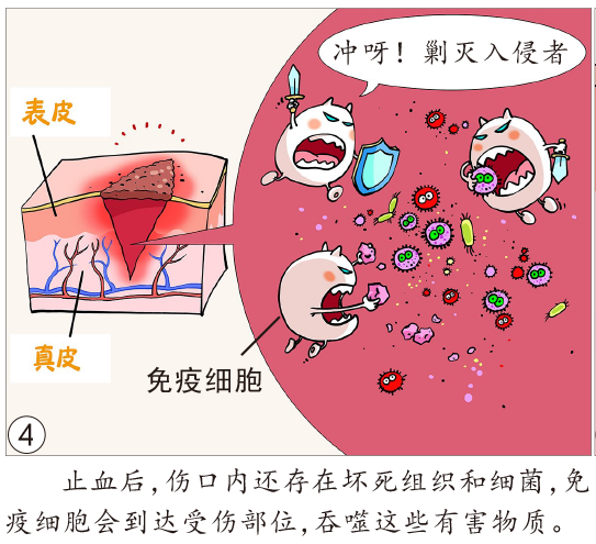 炎症期:免疫细胞围剿病菌。止血后,由于伤口内还存在坏死组织和细菌,作为免疫系统卫士的白细胞会迅速到达受伤部位,吞噬这些有害物质。这个过程中,伤口周围开始出现红、肿、热、痛,正是免疫系统开展“细菌剿灭大战”的外在表现。该过程一般不会持续太久,通常为3~5天。