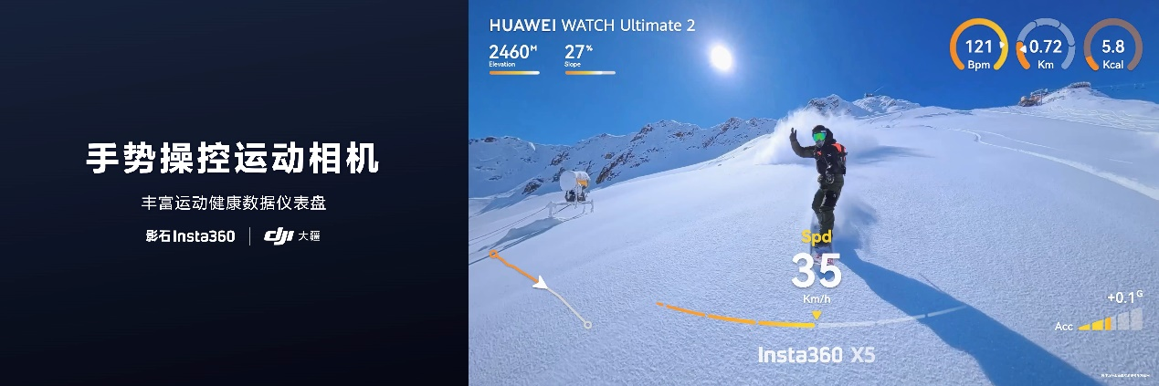 手表还能与三方相机(影石Insta360、大疆DJI)实现互联,让户外运动更便捷有趣。已支持多款全景相机、拇指相机、运动相机通过手表app进行互联,并通过手表手势操控轻松控制拍摄。其中,影石Insta360为华为穿戴用户打造了首款定制仪表盘,心率、速度、位置等数据可嵌入视频画面,让运动体验记录更丰富。