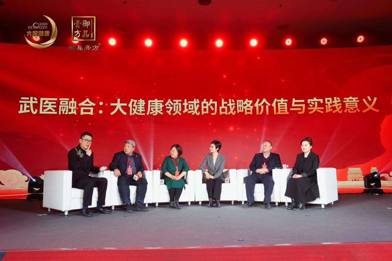 在圆桌对话环节,中国广告协会会长张国华、盘古智库老龄社会副院长李佳、故宫博物院宫廷史专家苑洪琪、《医药养生保健报》社长杨中兴、全国中医正气操推广大使孙宇驰、御品膏方项目总监单子倩,围绕武医融合在大健康领域起到的意义和重要作用展开深入探讨。