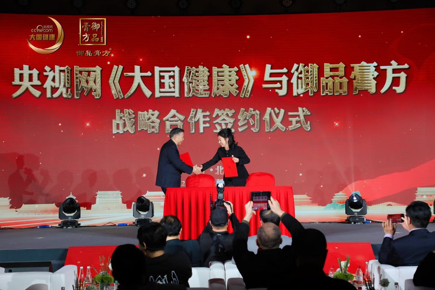 在思想碰撞之余,活动也迎来了重要时刻。央视网《大国健康》与御品膏方举行了战略合作签约,央视网老龄事业发展中心主任史健与御品膏方创始人姜洪英代表双方上台签约。