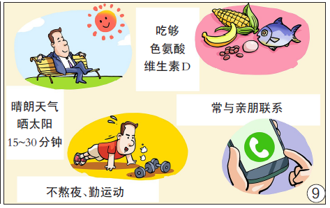 图9:应对冬季抑郁,要勤晒太阳、多吃富含色氨酸和维生素D的食物,规律作息、经常锻炼,保持社交互动。