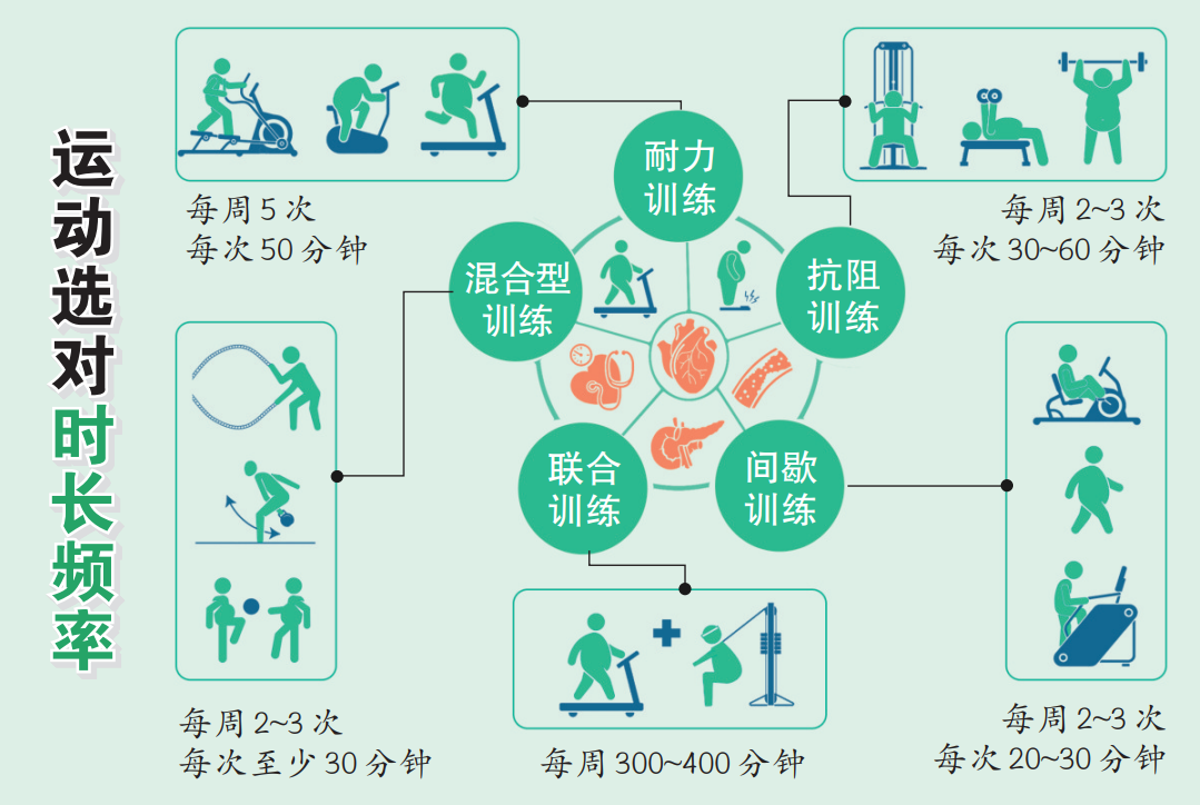 联合模式最能减重。有氧与抗阻训练相结合,就是联合训练模式,在改善超重和肥胖成年人的心脏代谢健康方面,堪称最佳干预方式,可显著降低血压、提高心肺适能;其缺点是所需时间较多,让人难以坚持。生活中,这种训练可用于对抗久坐行为,建议每周进行3~5次有氧运动,搭配2~3次抗阻训练,适合时间相对充裕、体能较好且能坚持高强度训练的人群。