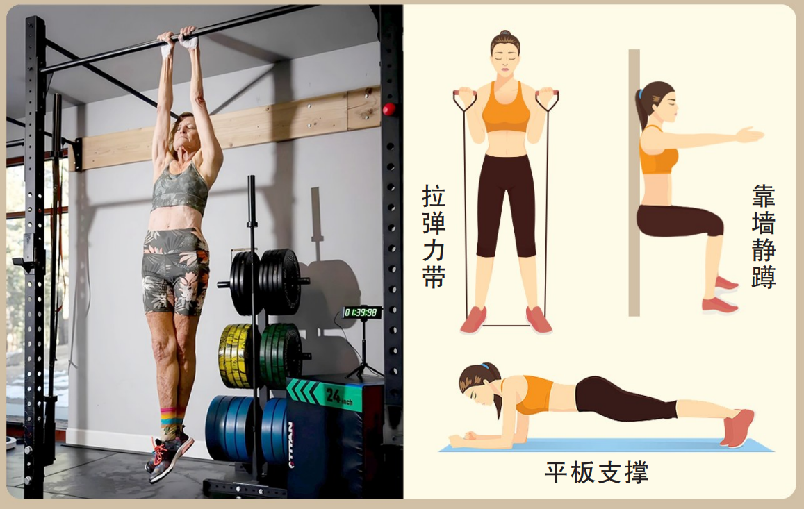 一堵墙、一瓶水做居家锻炼。不方便外出锻炼的老年人,可选择居家轻量化锻炼,无需专业器械。比如靠墙静蹲,可有效锻炼下肢;平板支撑能刺激胸肩、核心肌群;弹力带拉伸增强肩背力量,即使是徒手抓握矿泉水瓶,反复练习抓举、抬举,也能有效提升上肢力量。这些动作难度低、易操作,而且能随时灵活调整强度,比如觉得一瓶矿泉水太轻,可换成容量稍大的瓶子,循序渐进提升难度。