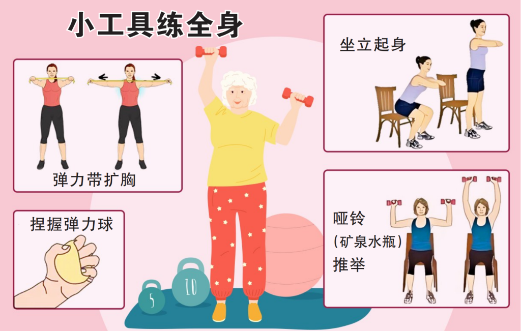 家有弹力带的老年人,可通过“拉”来强化特定肌群,初始建议用5~8磅的弹力带,能完成1~2组标准动作后可进阶至10~15磅,每个动作做10~12次为1组,做2~3组,全程不要耸肩、憋气。