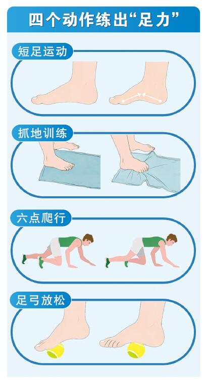 强化足底肌功能,可从坐姿入手练两个基础动作:一是在抓地测试的基础上,用脚趾反复抓起、放下毛巾;二是尝试把5个脚趾最大幅度地张开、并拢。“这两个动作在看电视、聊天时就能做,关键是让脚一直‘在状态’。”