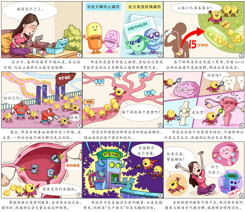 正所谓“擒贼先擒王”,布洛芬并不会直接消除已有的前列腺素,而是精准锁定前列腺素的“生产车间”——环氧化酶,与它相结合并阻断其活性,从源头阻止新的前列腺素合成。当新的前列腺素不再产生,体内原有前列腺素又被逐步代谢分解,痛觉信号的放大效应便会慢慢消退,我们感受到的疼痛也会随之减轻,直至消失。对于痛经等可预见的疼痛,止痛药不必等痛到无法忍受时再吃,提早服用能更好地抑制前列腺素合成,止痛效果会更理想。