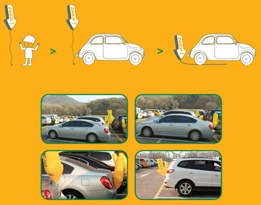 寻找停车位,是一件令开车族头疼的事情。在韩国,每位司机每次为了寻找停车位,至少要多跑500米,既浪费时间,又浪费汽油。为了解决这一问题,目前韩国部分停车场开始采用气球指示人们寻找停车位的方法。停车场在每个车位的后方都粘了一个黄色箭头状、标有“HERE”(这里)字样的气球。当车停入车位后,气球就会被压低。车离开、车位空出来后,气球又会自动飘起来,提示人们这里有车位。▲(来源:旅韩指南网)