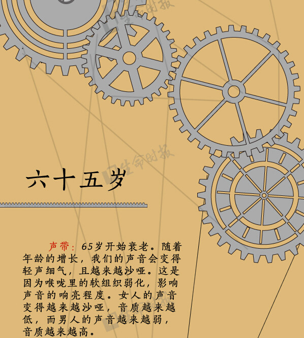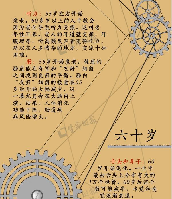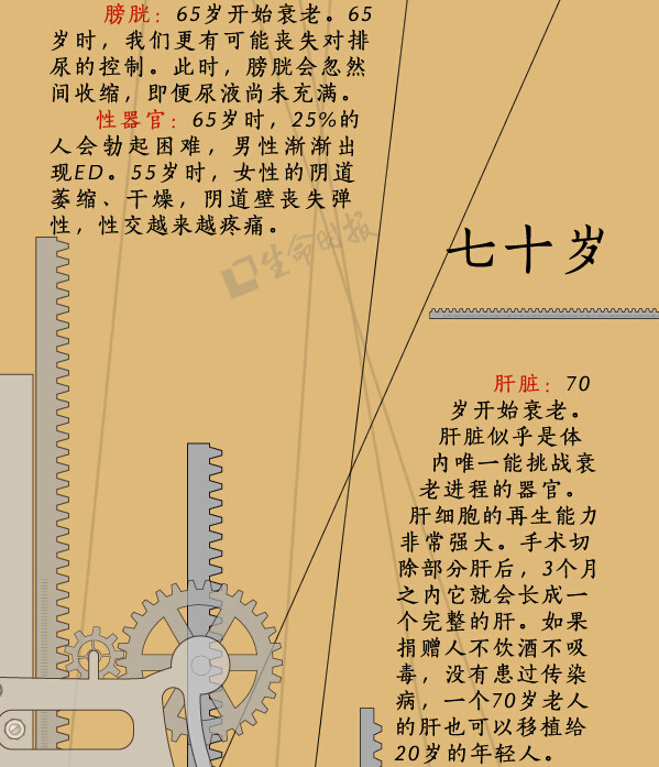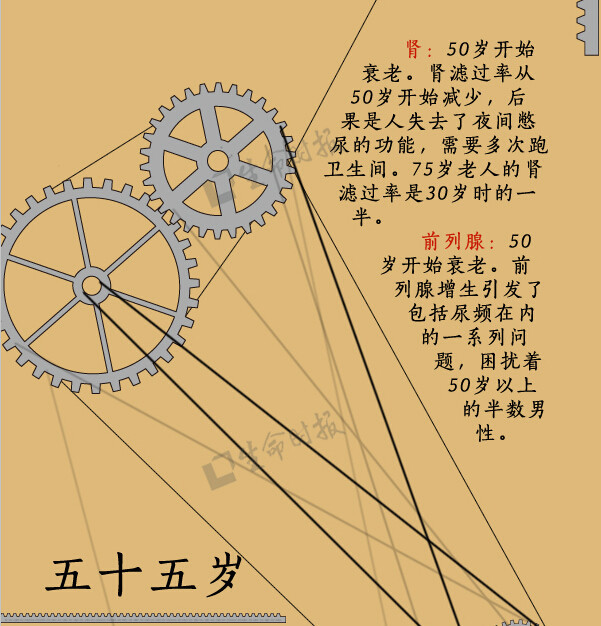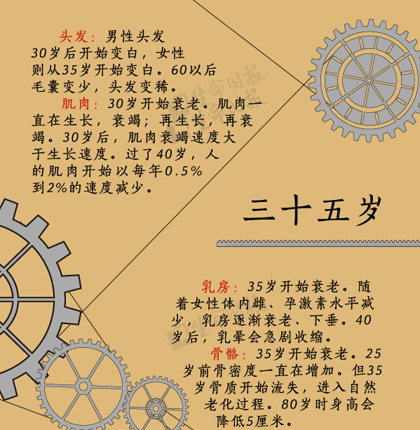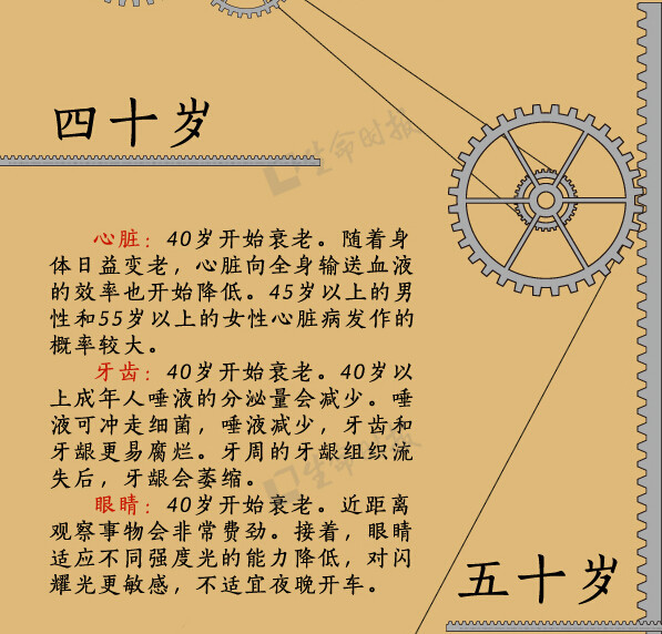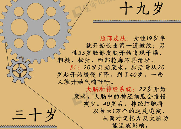 人体是一个有机整体,但每个“零件”走向衰老的过程却有先有后。比如,女性从19岁半起就开始长出第一道皱纹;30岁后,人体肌肉的衰竭速度大于生长速度;肾滤过率从50岁起开始减少……《生命时报》根据美国梅奥诊所专家的研究,用一张图为你揭示“器官衰老的秘密”↓