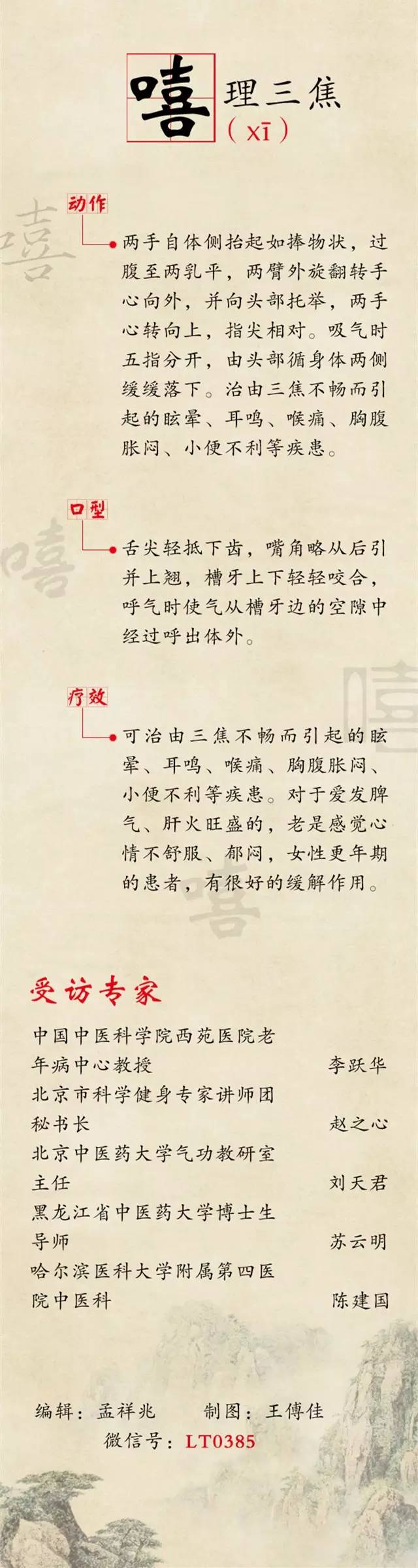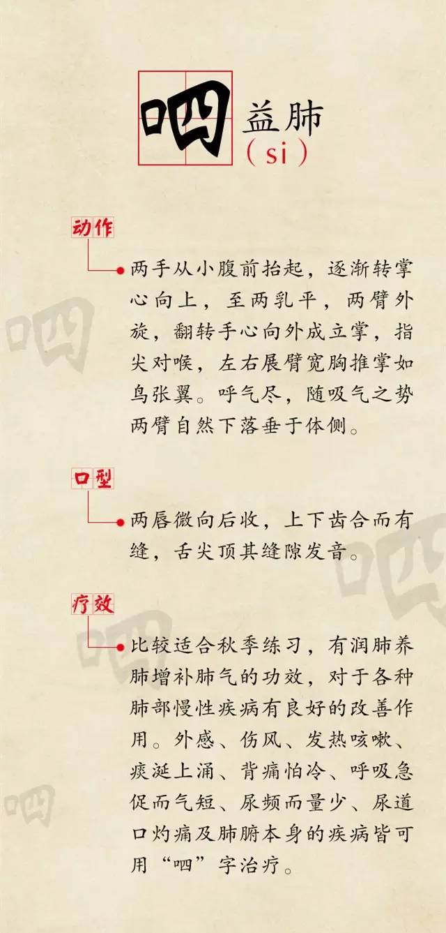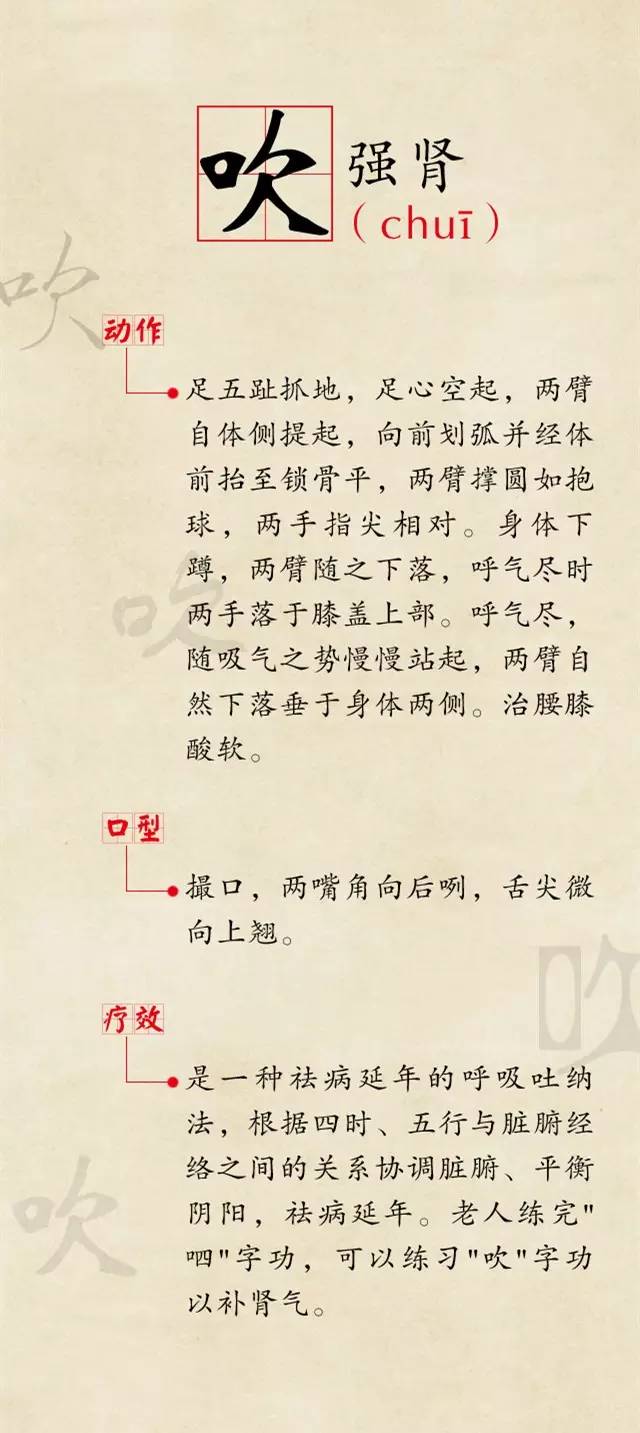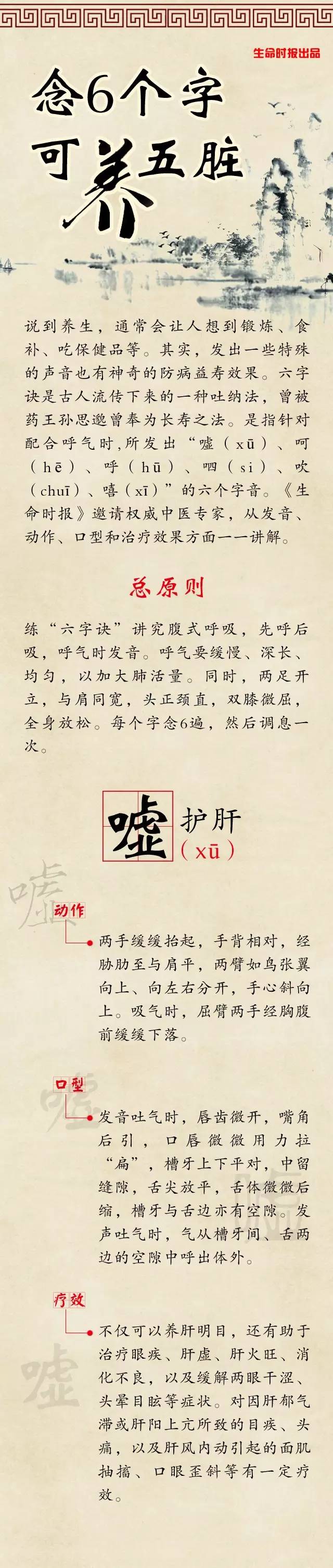 【导读】说到养生,通常会让人想到锻炼、食补、吃保健品等。其实,发出一些特殊的声音也有神奇的防病益寿效果。“六字诀”是古人流传下来的一种吐纳法,曾被药王孙思邈曾奉为长寿之法,是指针对配合呼气时,所发出“嘘(xū)、呵(hē)、呼(hū)、呬(si)、吹(chuī)、嘻(xī)”的六个字音。《生命时报》邀请权威中医专家,从发音、动作、口型和治疗效果方面为你一一讲解。
