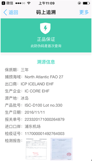 8月23日,在被称为“新零售”标杆的北京十里堡盒马鲜生举行的体验活动上,记者看到,每盒冰岛海参上均赋有“码上放心”二维码。用阿里健康、手机淘宝、天猫或支付宝APP扫码,便可显示海参的打捞海域、生产日期、口岸信息、检验检疫单号、报关单号、检验报告等一系列信息,从而达到帮助消费者鉴别海参产地和真伪的效果。
