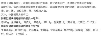 莲花清瘟、抗病毒口服液、金花清感、藿香正气、热毒宁、清瘟败毒散等,及喜炎平、血必净、参附和生脉4种注射液,都作为有抗病毒作用的中药组分纳入诊疗推荐方案中。